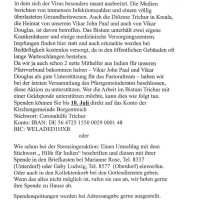 "Da der 7-Tages-Inzidenzwert am 24. Dezember mit 210,33 (Quelle: Homepage des Kreises Höxter) den kritischen Wert von 200 überschritten hat, kann die Feier von Präsenzgottesdiensten nicht mehr verantwortet werden. In Abstimmung mit dem Ordnungsamt der Stadt Borgentreich werden zunächst alle Gottesdienste bis einschließlich Sonntag, 10. Januar 2021, abgesagt. Falls die Situation sich vorher wider Erwarten grundlegend verbessert, muss neu überlegt werden."