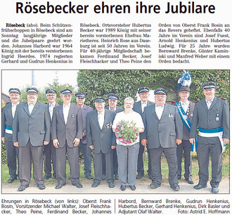 Schützenfest mit Königschießen für 2015 05. - 06.07.2014 Der Schützenverein Rösebeck feiert sein Fest des Jahres am 5. und 6. Juli. Unter anderem wird das Königsschießen für 2015 durchgeführt. Beginn ist bereits am Freitag (04.07.) mit den Ständchen für verdiente Mitglieder durch den Spielmannszug. Am Samstag, 5. Juli treten alle Schützen um 18.15 Uhr vor der Bördeblickhalle zur Schützenmesse an. Diese beginnt um 19 Uhr. Anschließend erfolgt die Kranzniederlegung am Ehrenmal. Ab 20:30 Uhr ist Tanz bei freiem Eintritt mit der Tanzband "Blue Notes". Am Sonntag, 6. Juli, treten alle Schützen um 9:30 Uhr vor der Halle an, um den amtierenden König Dirk Basler abzuholen. Zusammen wird dann der traditionelle Frühschoppen gefeiert. Es stehen auch Ehrungen an. Gegen 13 Uhr beginnt das Königschießen. Ermittelt wird der König für das Schützenfest 2015. Ab 14 Uhr gibt es Kaffee und Kuchen. Nach der Proklamation des neuen Königs gegen 17 Uhr klingt das Fest langsam aus. HINWEIS: Wer eine neue Schützenkrawatte benötigt, kann eine solche beim Vorsitzenden Michael Walter zum Preis von 13 € erwerben.