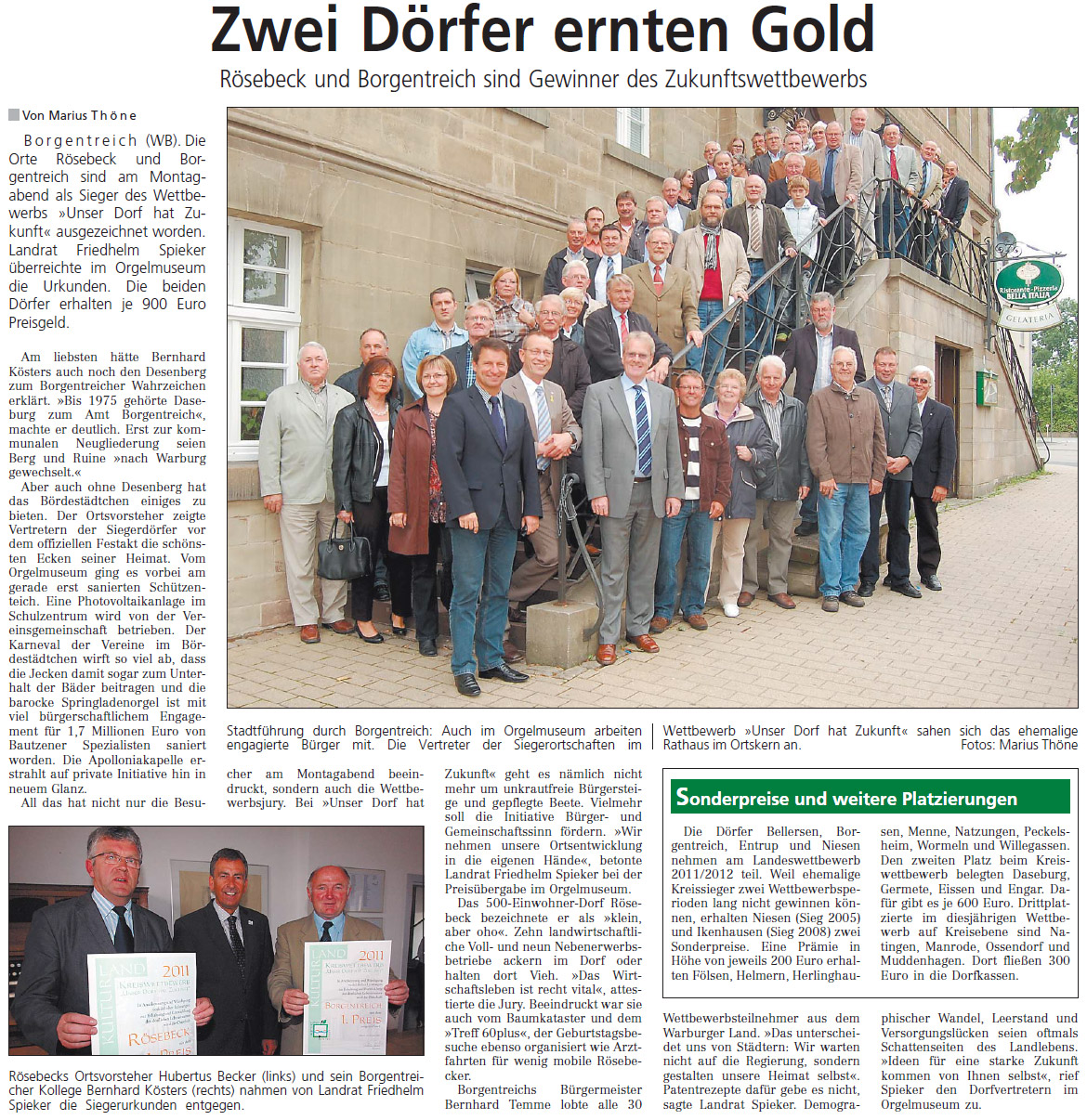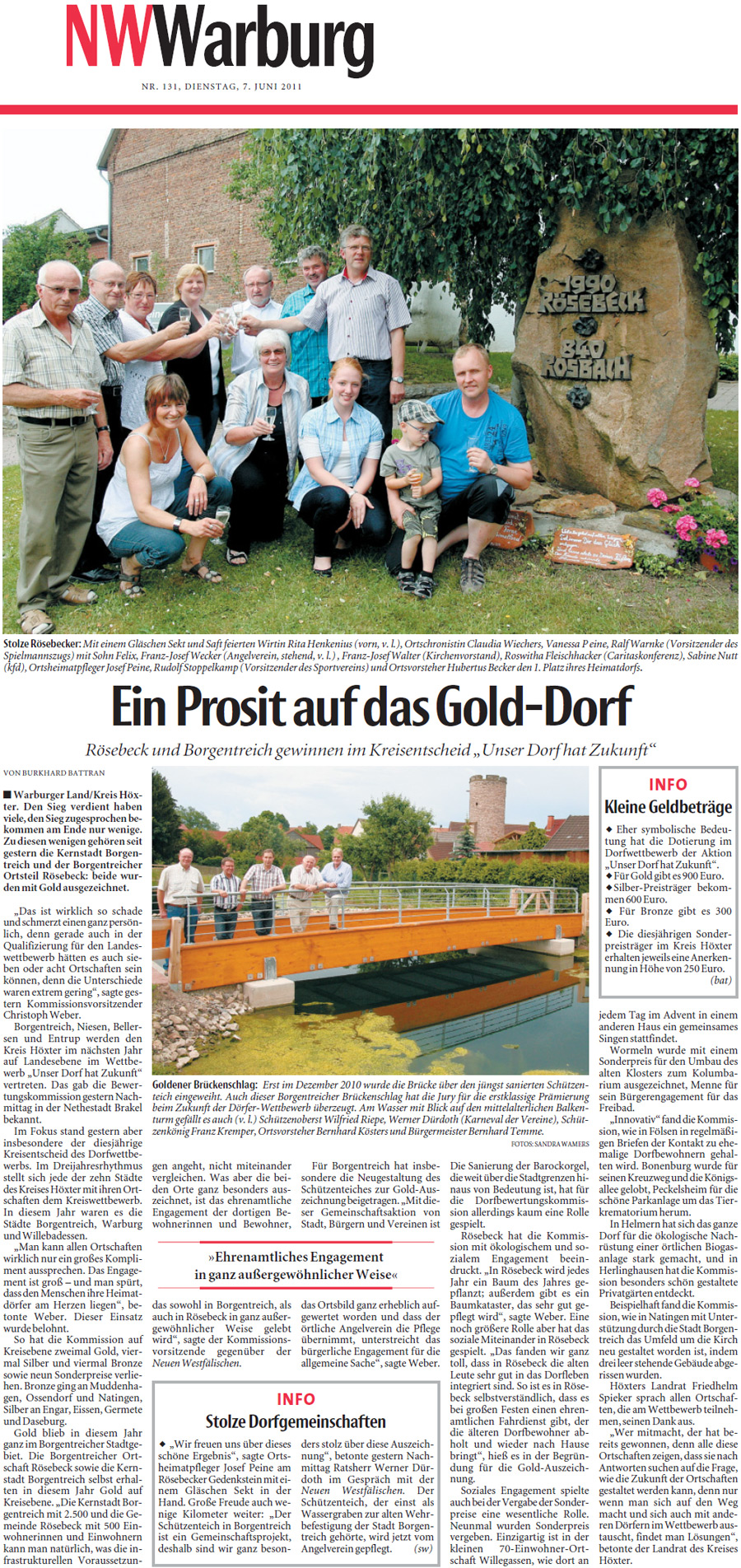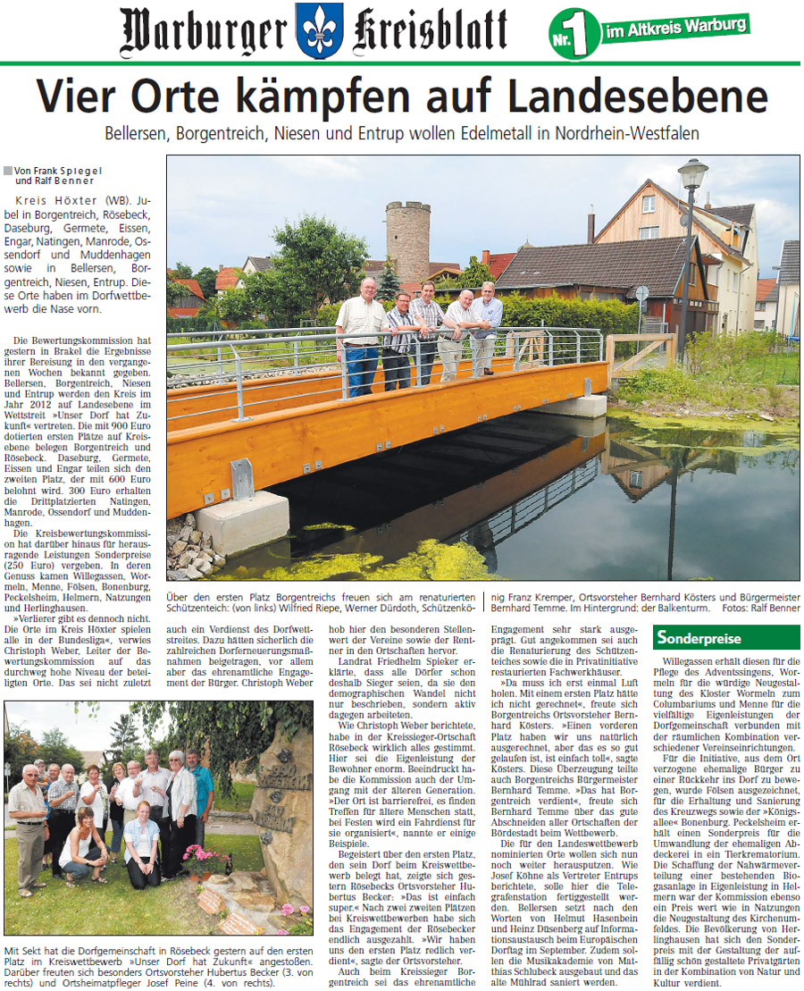 Rösebeck ist Golddorf 2011 Am Kreiswettbewerb „Unser Dorf hat Zukunft" haben 29 Dörfer aus dem Gebiet der Städte Borgentreich, Warburg und Willebadessen teilgenommen. Die Ergebnisse sind am 6. Juni in der Landwirtschaftskammer Brakel bekanntgegeben worden. Vor dem Hintergrund der vielfältigen Aktivitäten der Dorfgemeinschaft in der jüngeren Vergangenheit wurde Rösebeck nach mehreren Zweitplatzierungen in diesem Jahr einer der beiden Sieger (neben Borgentreich) im Kreiswettbewerb. Rösebeck ist damit zum 2. Mal Golddorf nach 1996. > Presseartikel Neue Westfälische vom 07.06.2011 < > Presseartikel Westfalen-Blatt vom 07.06.2011 <