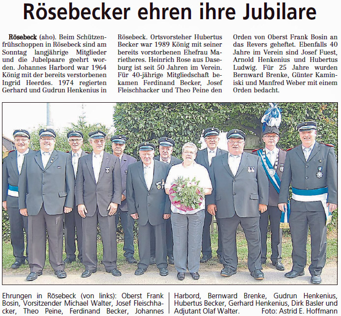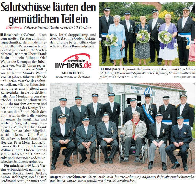 Frank Bosin ist König 2015 06.07.2014 Schützenoberst Frank Bosinhat die Königswürdefür das Jahr 2015in Rösebeck errungen. Er regiert zusammenmit seiner Ehefrau Sabrina. Die Freude der Schützen ist groß. Königspaar 2015: Frank & Sabrina Bosin Ehrungen am Sonntagmorgen - von links: Oberst Frank Bosin, Johannes Harbord (Jubelkönig 50 Jahre), Bernward Brenke (25 Jahre Mitglied), Theo Peine, Josef Fleischhacker, Ferdi Becker (40 Jahre Mitglied), Gerhard Henkenius, Gudrun Henkenius (Jubelkönigspaar 40 Jahre), Hubertus Becker (Jubelkönig 25 Jahre), Adjutant Olaf Walter Presseartikel Westfalen-Blatt vom 07.07.2014: