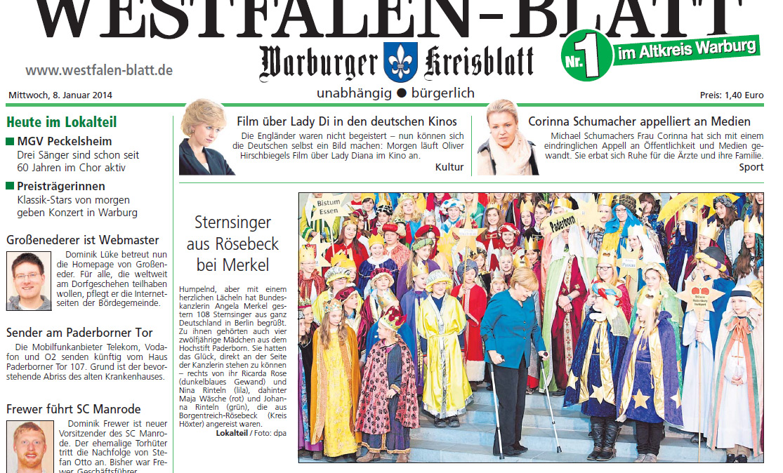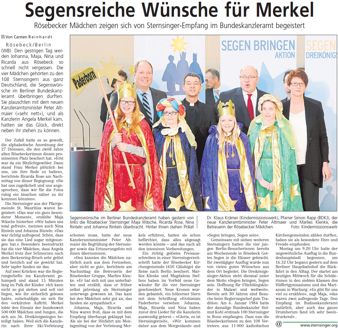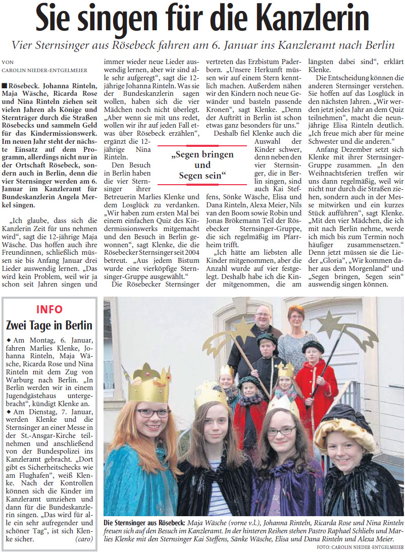 Rösebecker Sternsinger im Bundeskanzleramt 07.01.2014 Die vier 12-jährigen Sternsinger Ricarda Rose, Maja Wäsche, Nina Rinteln und Johanna Rinteln sowie als Begleiterin Maria-Elisabeth Klenke aus der St. Mauritius-Gemeinde in Rösebeck vertraten das Erzbistum Paderborn am 7. Januar 2014 beim Sternsinger-Empfang von Bundeskanzlerin Angela Merkel in Berlin. > Presseartikel Neue Westfälische vom 02.01.2014 < > Artikel Erzbistum Paderborn vom 07.01.2014 < > Frontseite Westfalen-Blatt vom 08.01.2014 < > Presseartikel Westfalen-Blatt vom 08.01.2014 < Foto: Vorbericht NW vom 02.01.2014 Foto: Bundesregierung Foto: Bundesregierung Foto: Bundesregierung