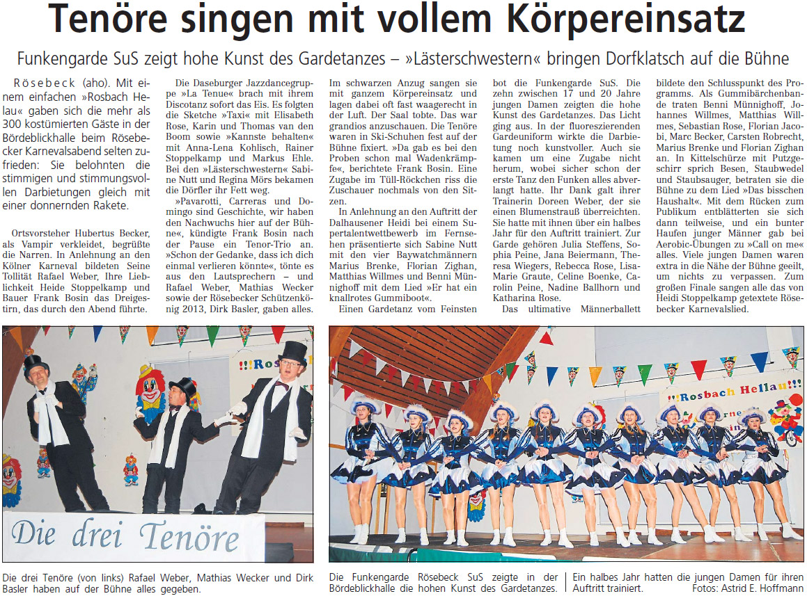 Karneval der Rösebecker Vereine 2014 22.02.2014 Mit "ROSBACH HELAU" startet am Samstag, 22. Februar der traditionelle Karneval der Rösebecker Vereine und die Bördeblickhalle erlebt wieder ausgelassenes und närrisches Treiben. Beginn ist um 19.31 Uhr. Nach zum Teil langer und schweißtreibender Vorbereitung freuen sich die heimischen Künstlerinnen und Künstler auf ihren Auftritt. Auch die übrigen Vorbereitungen laufen schon seit längerer Zeit auf Hochtouren. Unter der Moderation des Elferrat-Dreigestirns erwartet die Närrinen und Narren wieder ein bunt gemischtes und reichhaltiges Programm mit Büttenreden, Sketchen und Tanzdarbietungen. Neben einer benachbarten Jazzdance-Formation darf der Dorftratsch mit den Lästerschwestern natürlich nicht fehlen. Selbstverständlich wurde im Laufe der letzten Monate auch das Fernsehprogramm beobachtet. Hierbei ist das Supertalent aufgrund der regionalen Besonderheiten natürlich besonders ins Auge gefallen und wird Thema sein. Außerdem haben 3 aus Funk und Fernsehen bekannte Gesangstalente ihren Auftritt. Fehlen darf natürlich auch nicht das Männerballett und die bekannte Funkengarde Rösebeck mit einem Gardetanz sowie das neue Rösebecker Karnevalslied. Auch in diesem Jahr wird es wieder eine Kostümprämierung geben. Nach dem offiziellen Teil kann bei der Musik der Tanz- und Partyband "The Moonlights" aus Brakel kräftig getanzt und gefeiert werden. Fotos gibt's im Fotoalbum > Presseartikel Westfalen-Blatt vom 24.02.2014 <